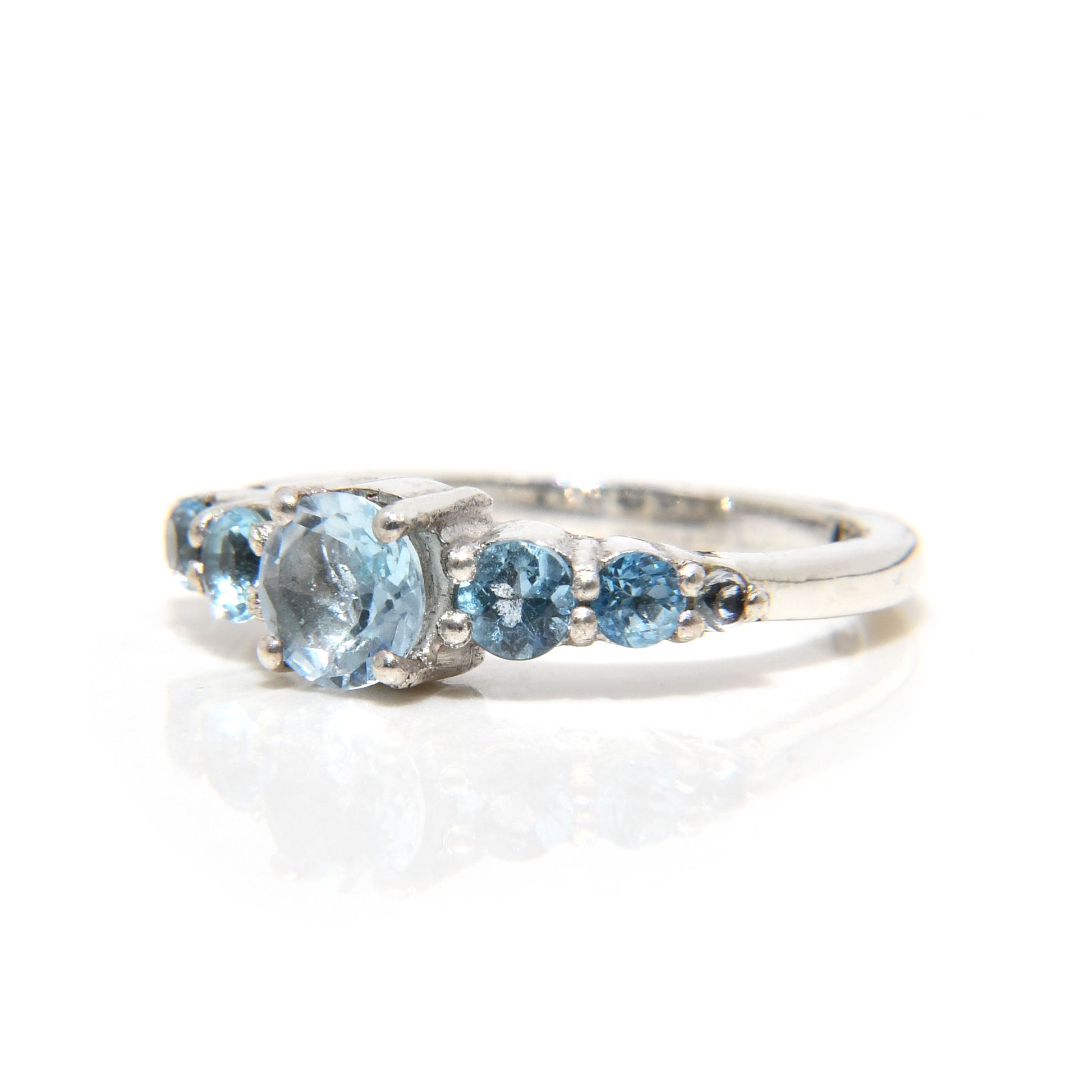 Un hermoso anillo con topacios azules acompañado de diamantes en los extremos.