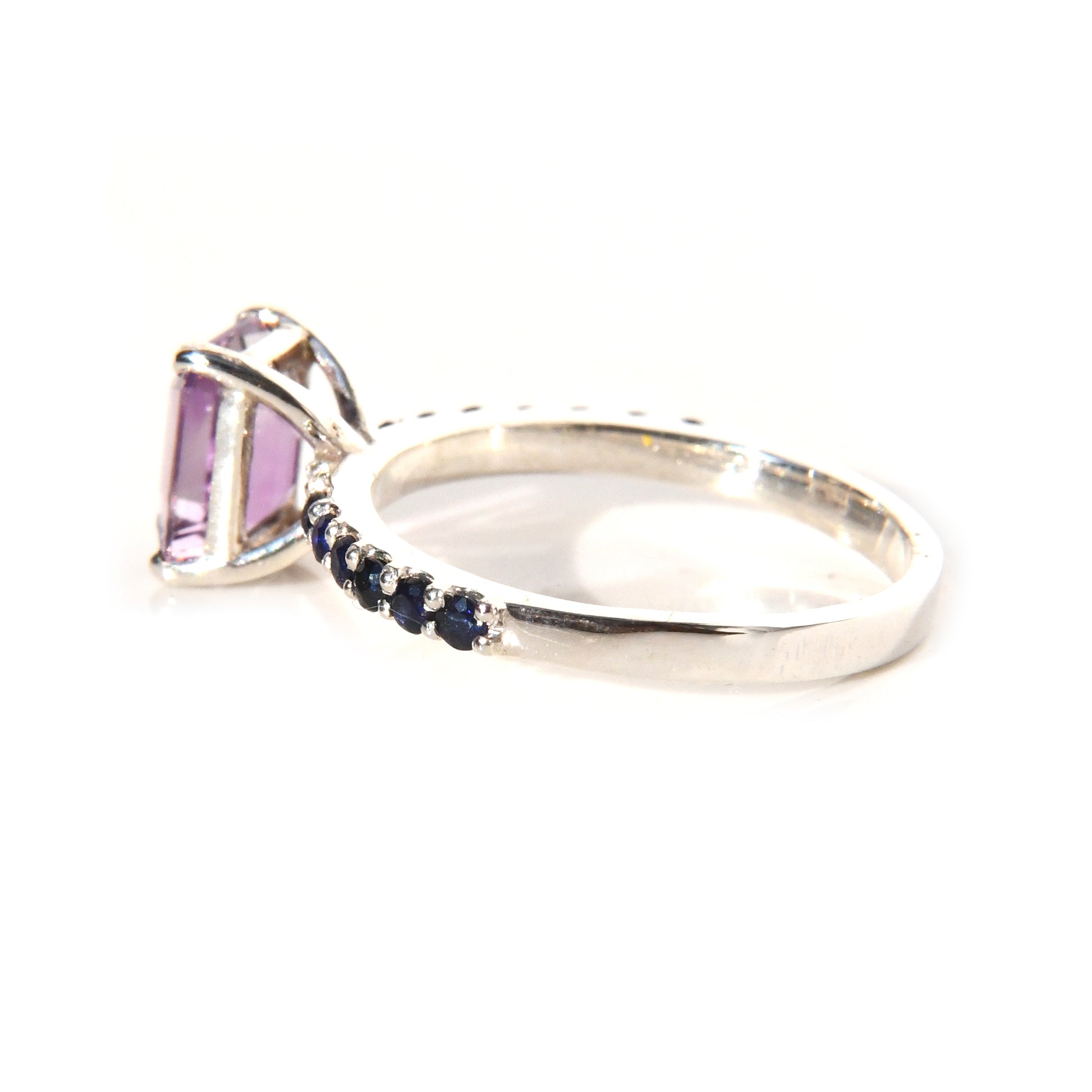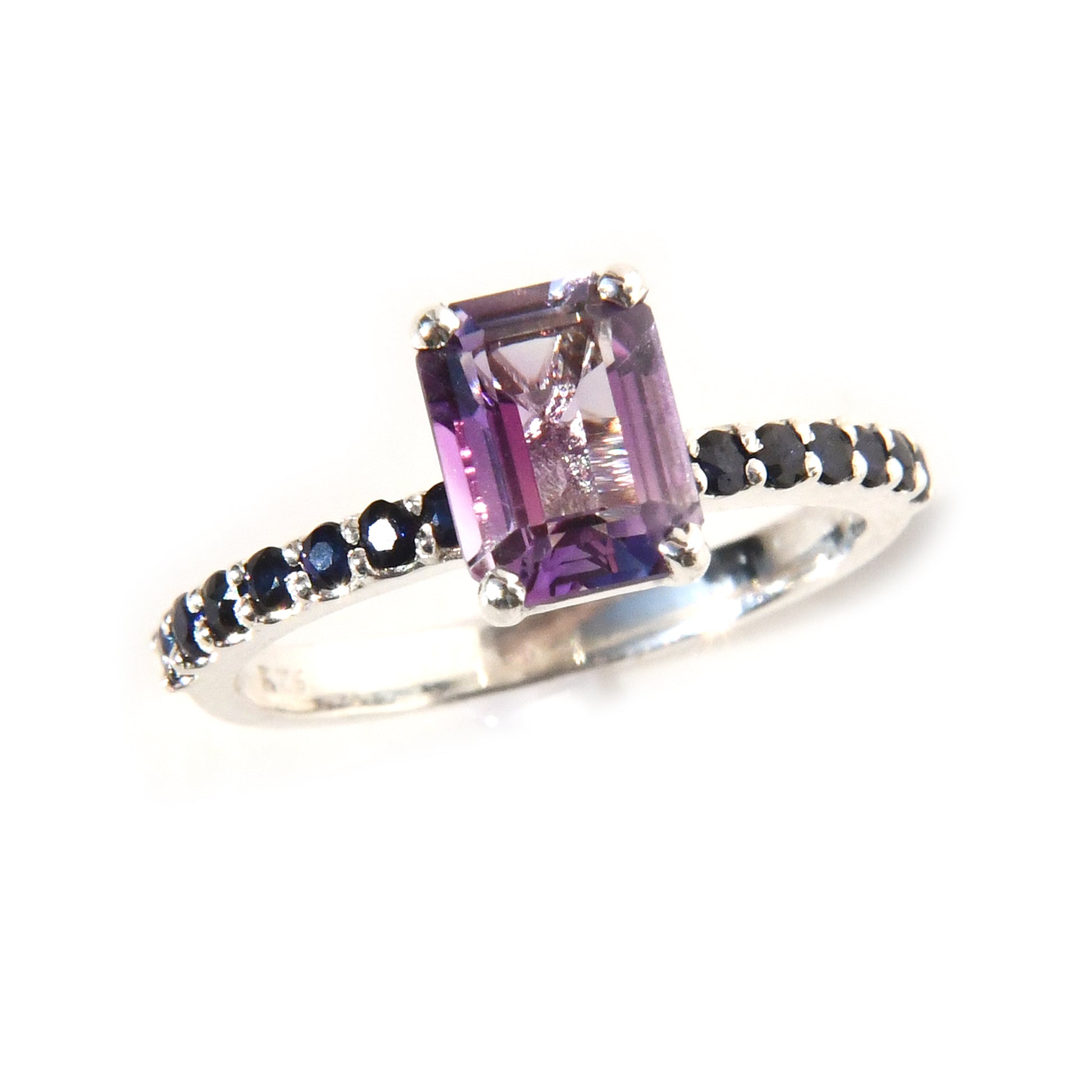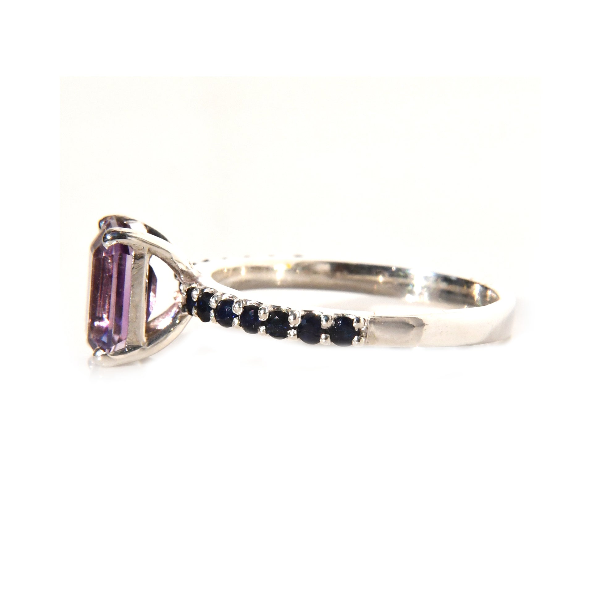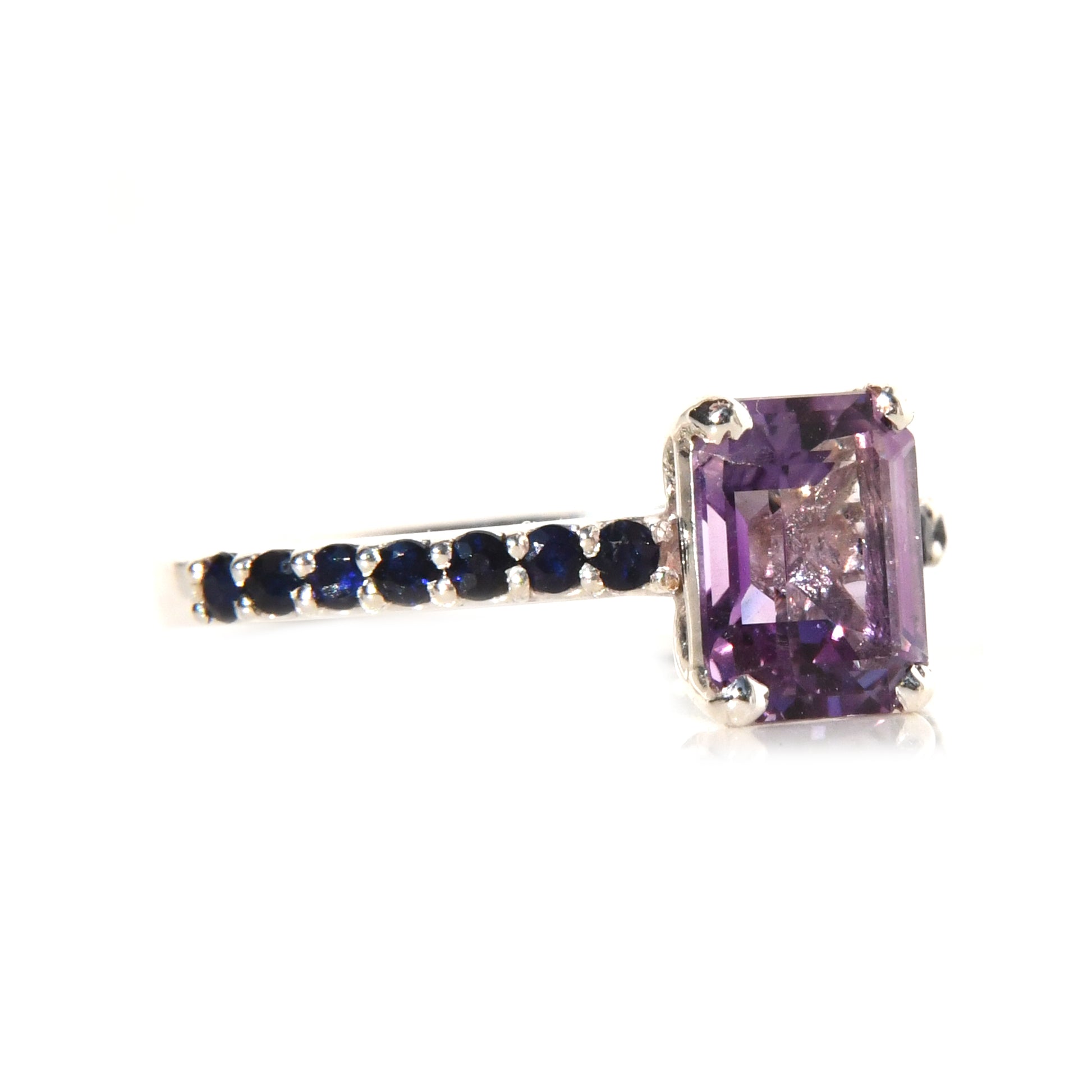 Anillo de compromiso con una hermosa amatista natural corte esmeralda de 1.5cts acompañada de zafiros en los brazos