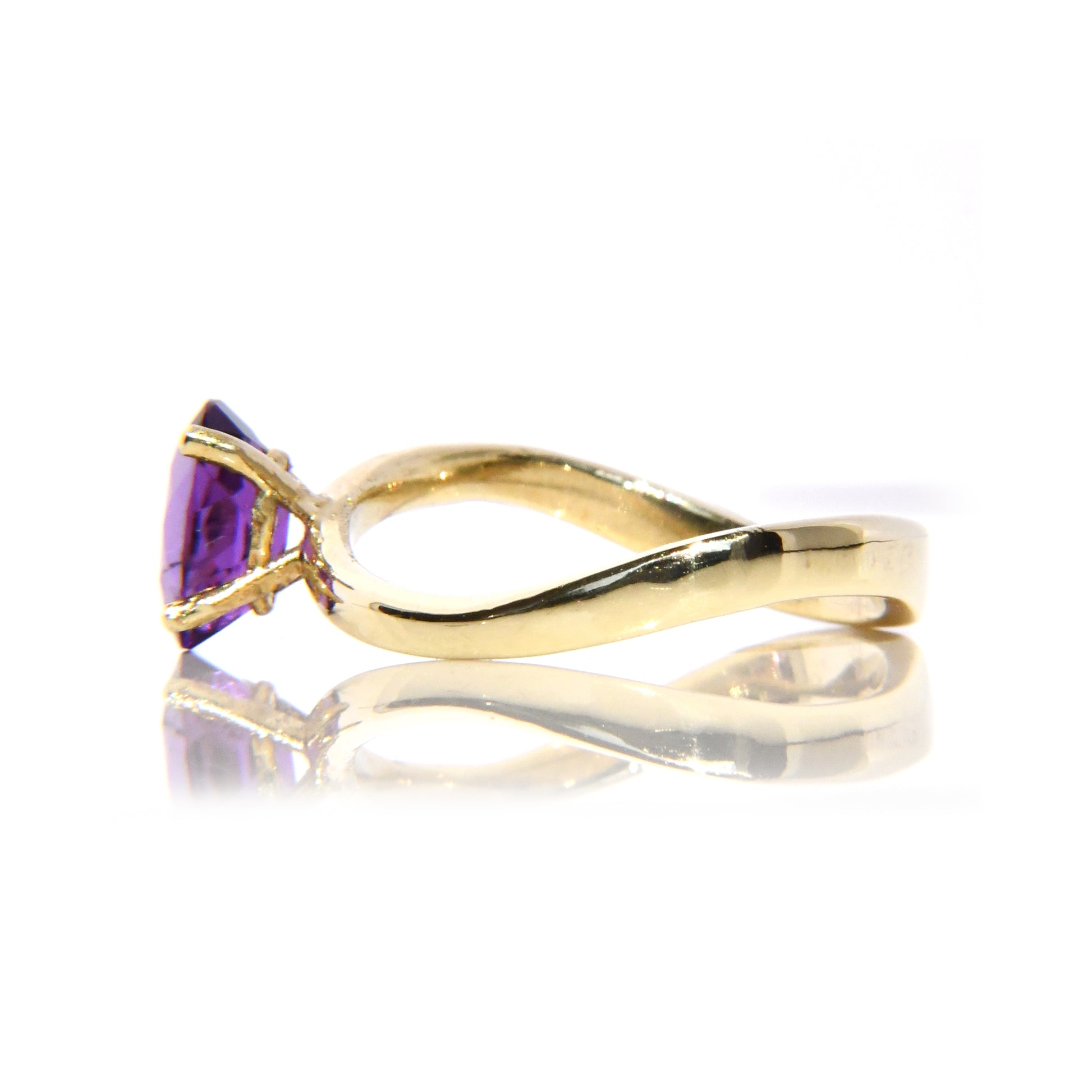 Un anillo con una amatista corte cushion y diamantes dispuestos en norte-sur, este- oeste.