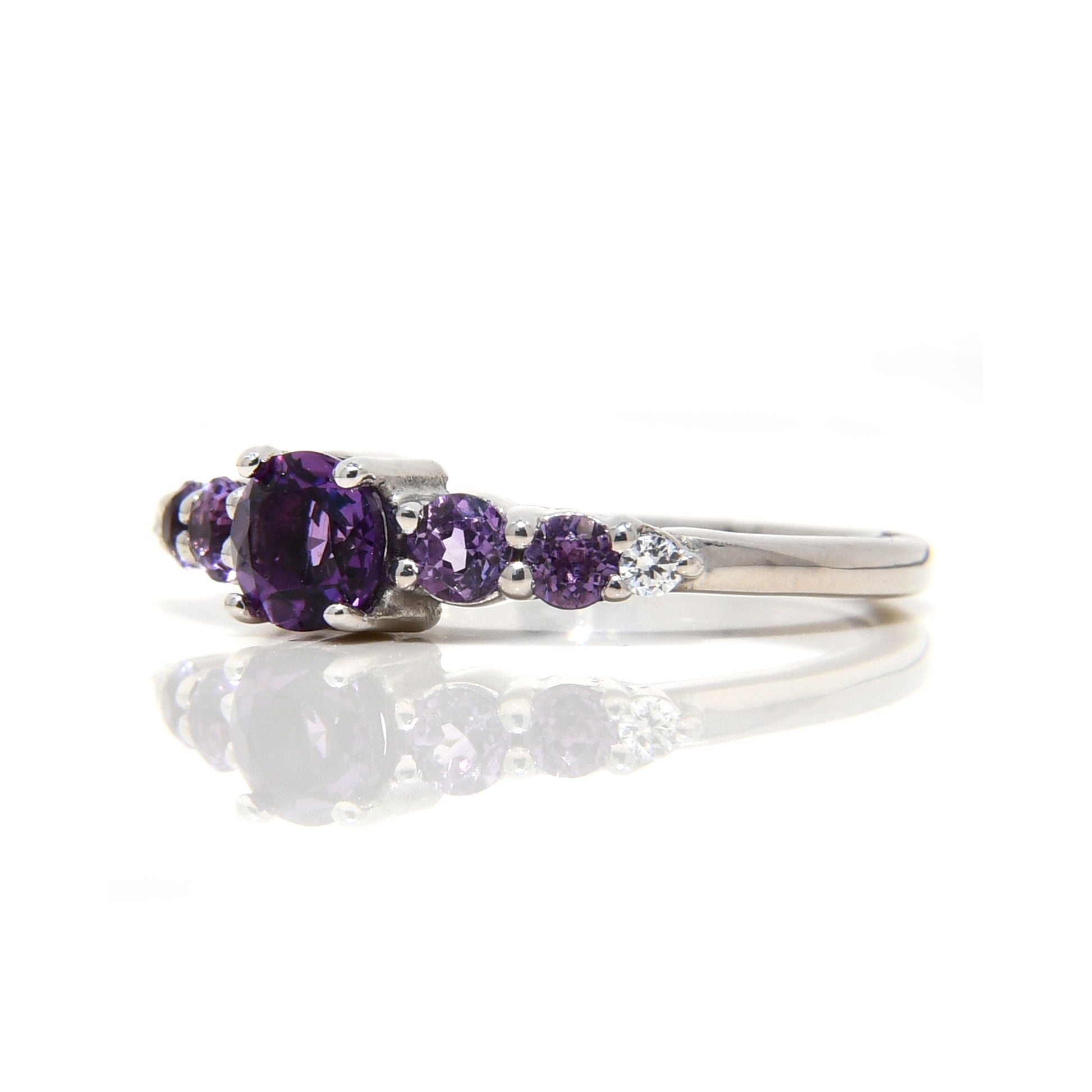 Diseñado a la perfección, este hermoso anillo esta adornado con amatistas a lo largo del cuerpo, acompañados de diamantes en los extremos, un anillo único y realmente hermoso.
