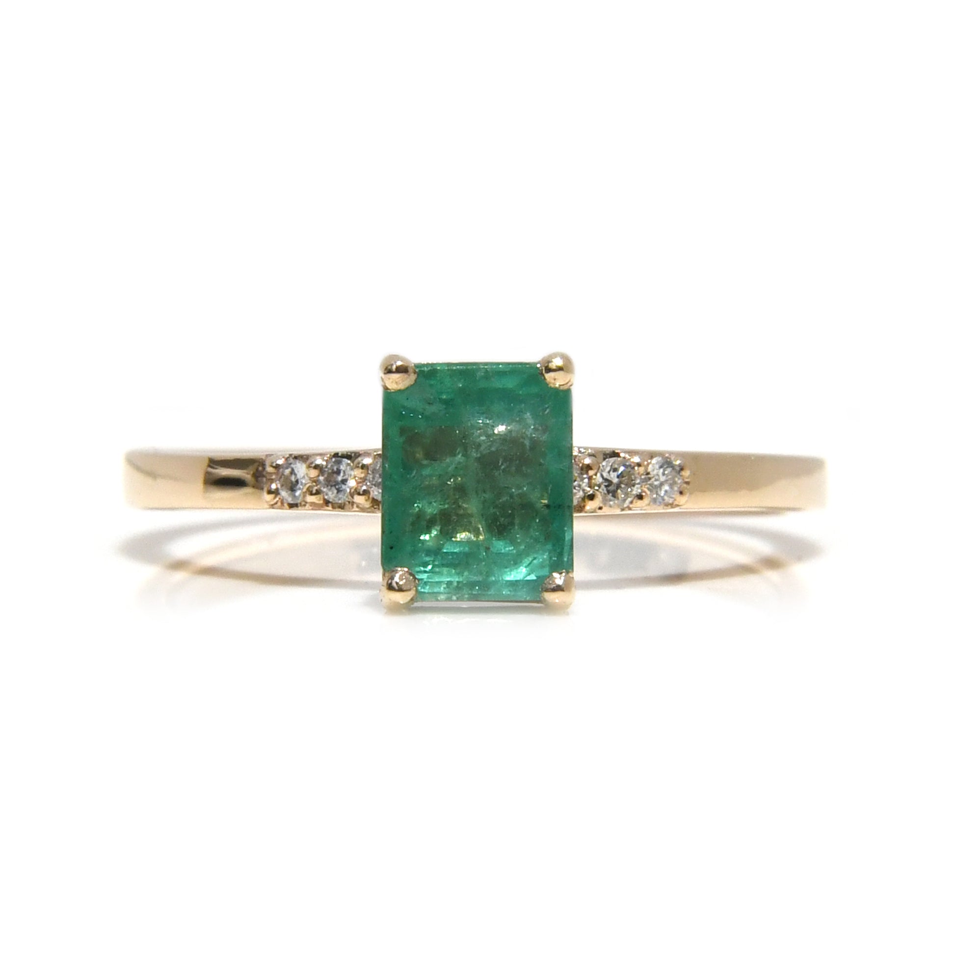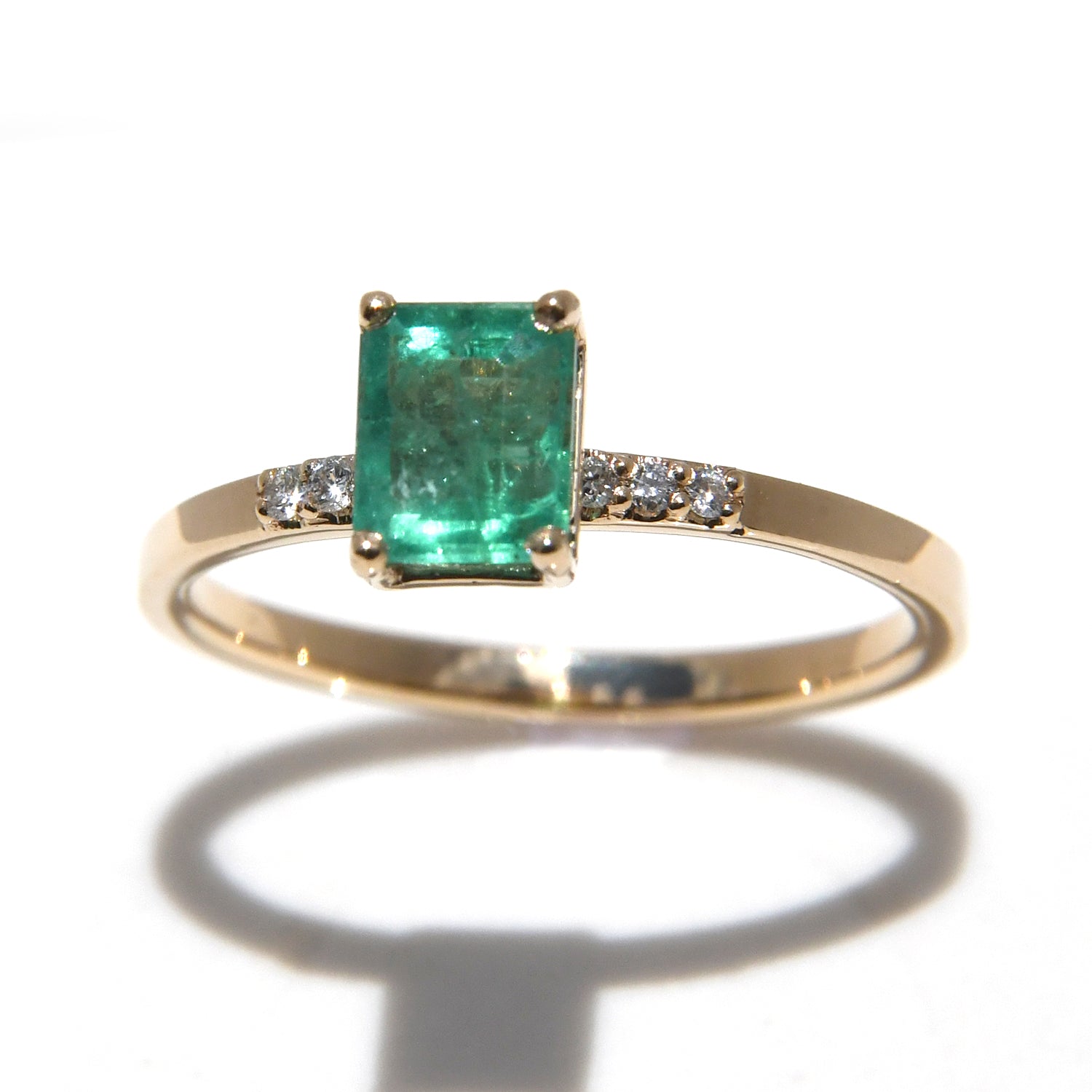Un hermoso anillo con una esmeralda natural acompañada de 6 diamantes corte circular
