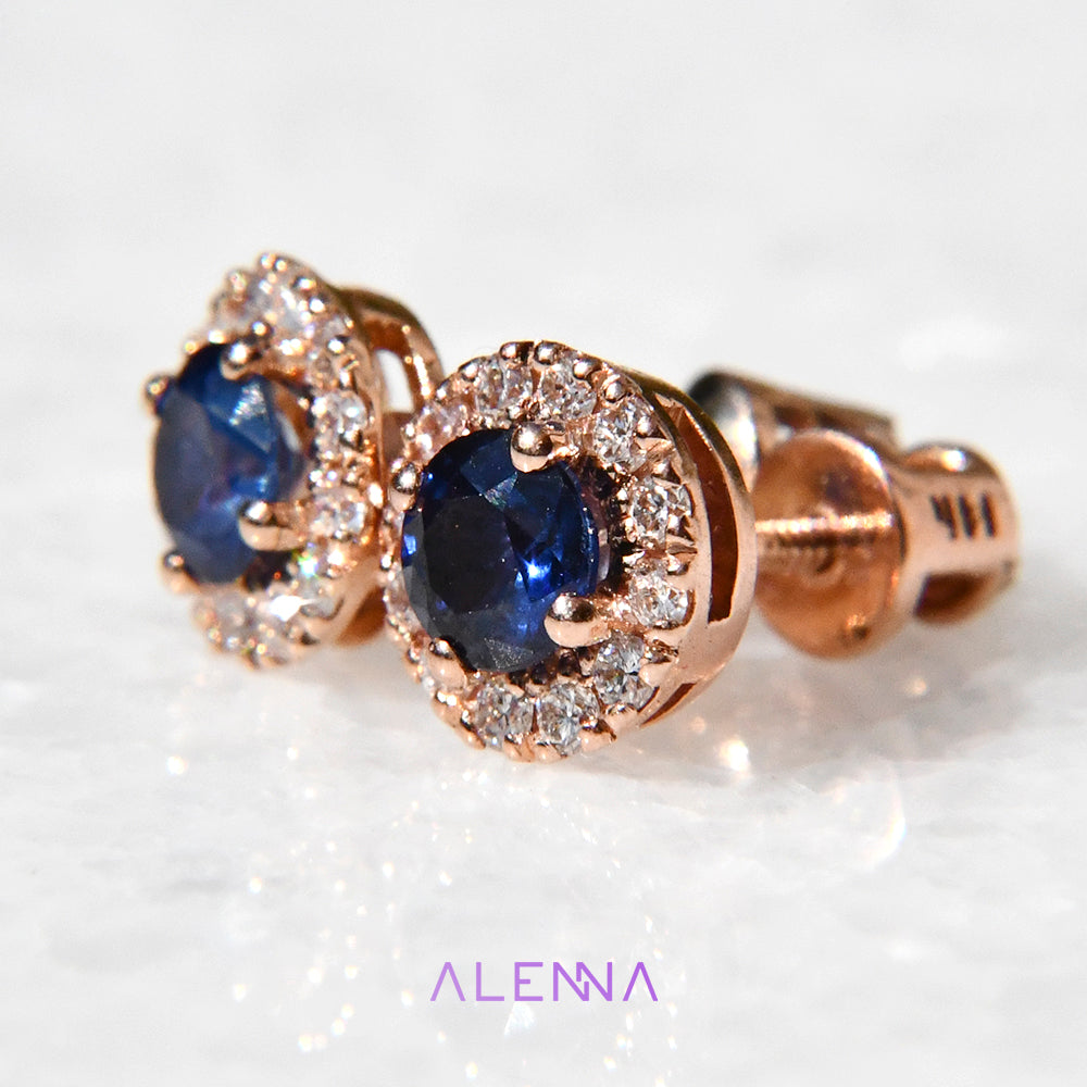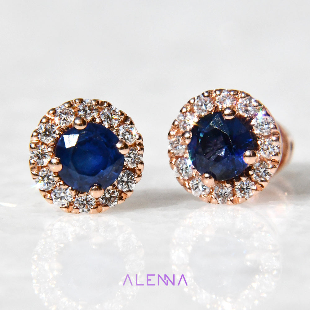 Aretes con Zafiros Azules y Halo de Diamantes en oro sólido de 14k.