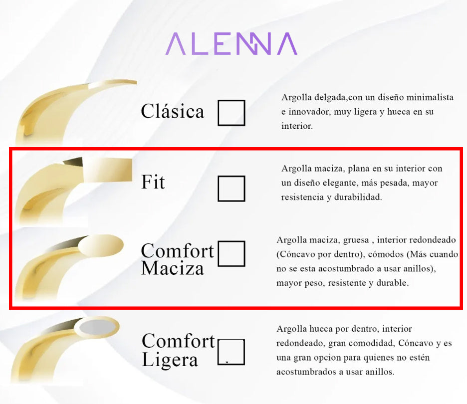 Los acabados que empleamos en nuestros anillos son "FIT" y "Comfort Maciza" para garantizar la durabilidad y calidad de nuestras piezas.
